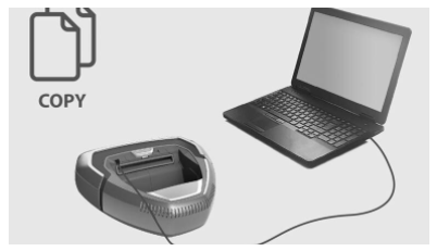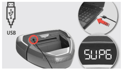 Koble roboten til datamaskinen ved hjelp av en mikro-USB. Datamaskinen kjenner igjen roboten som en USB- masselagringsenhet. Displayet på roboten vil vise «SUPG». (Pass på at du benytter en USB-kabel som ikke bare er til lading, men også til overføring av data.)