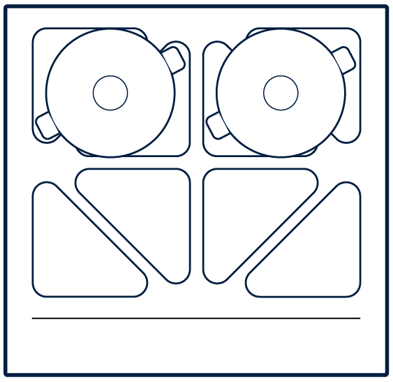- 60 cm: opptil 4 mellomstore panner (160–210 mm) kan varmes opp samtidig